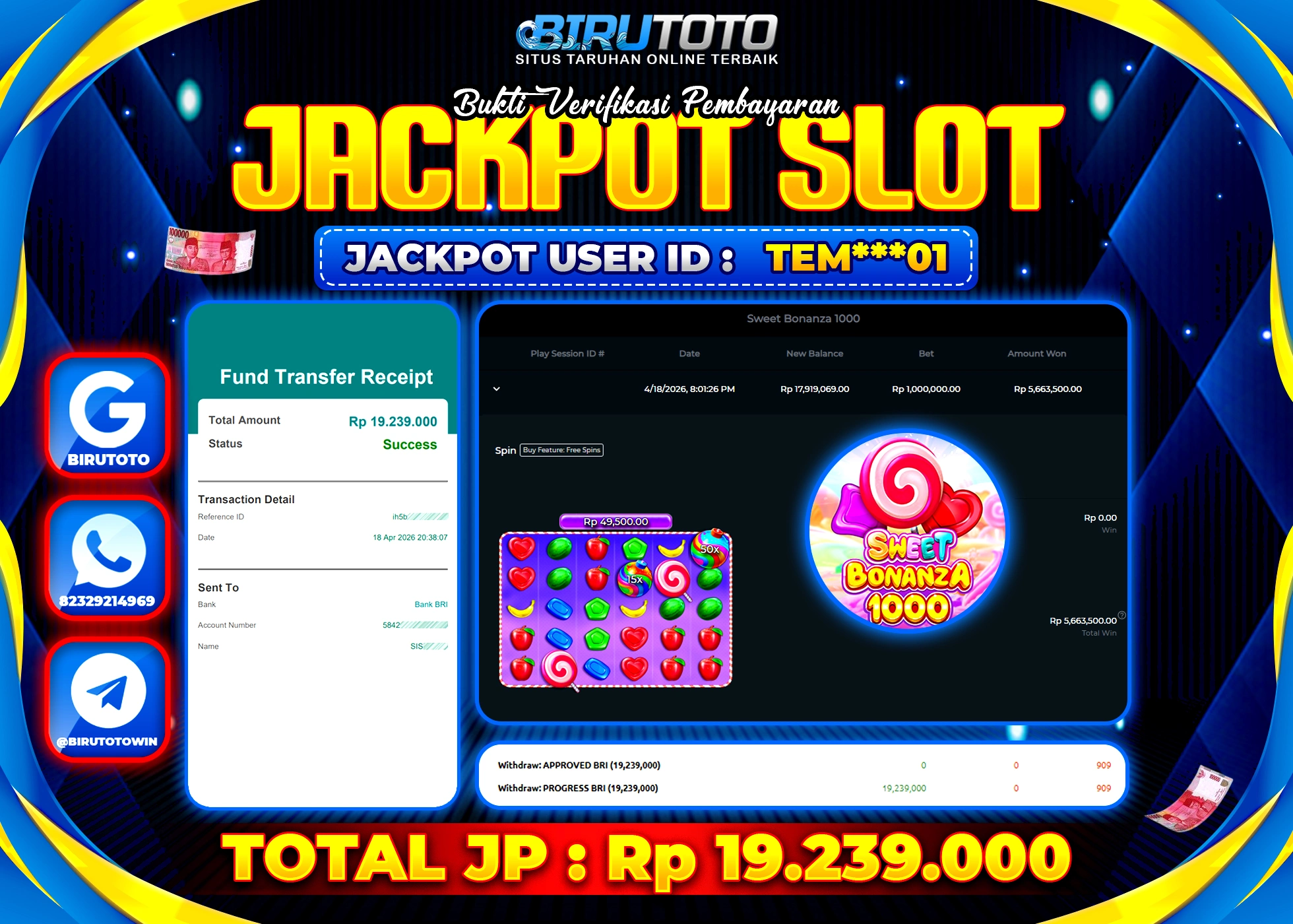 BIRUTOTO JACKPOT SLOT SWEET BONANZA 1000 Rp.19.239.000 LUNAS