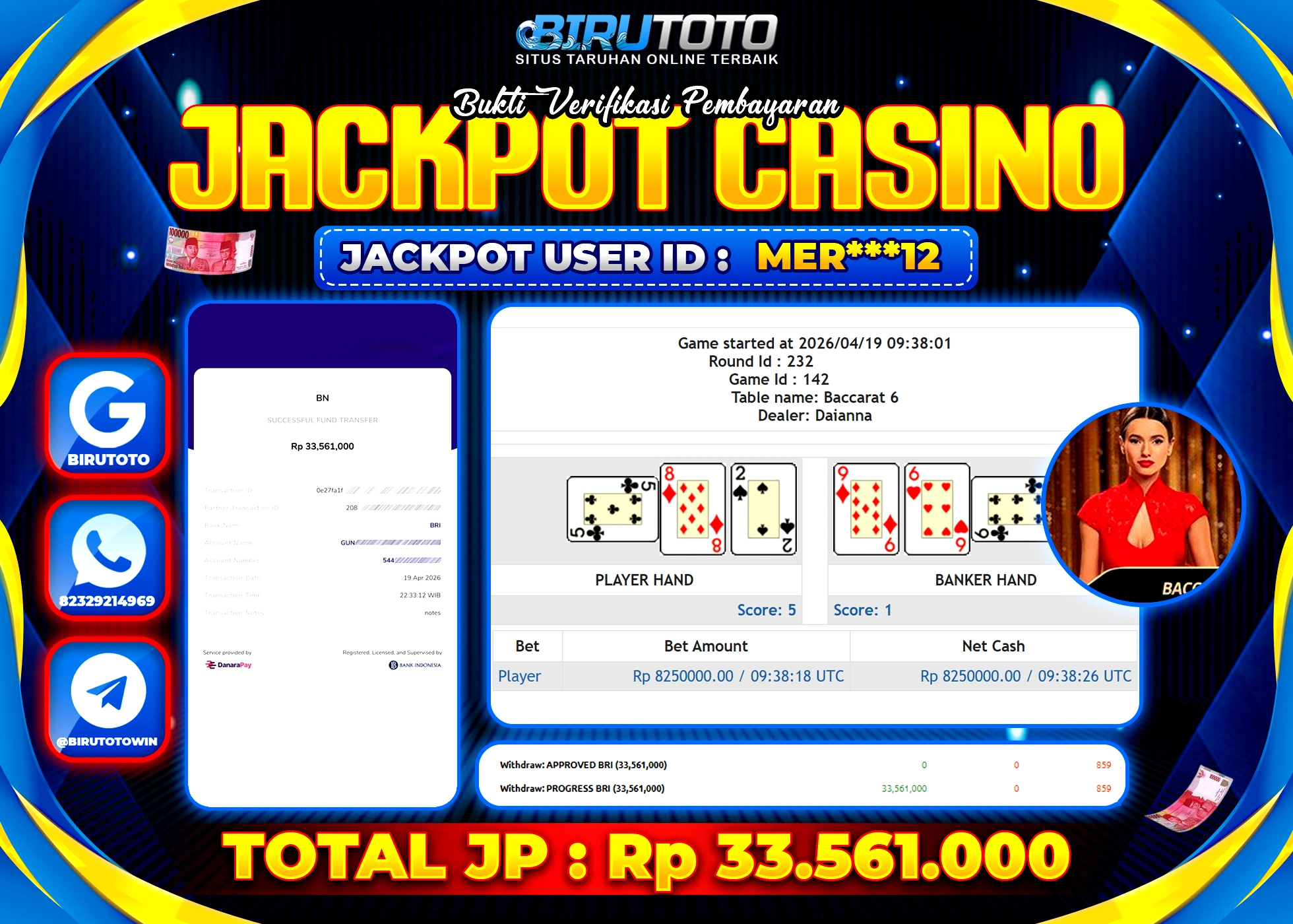 BIRUTOTO JACKPOT LIVE CASINO BACCARAT Rp.33.561.000 LUNAS