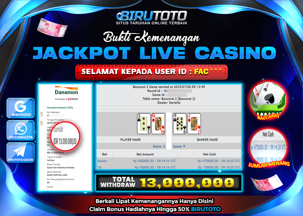 BIRUTOTO JACKPOT LIVE CASINO BACCARAT Rp.13.000.000 LUNAS