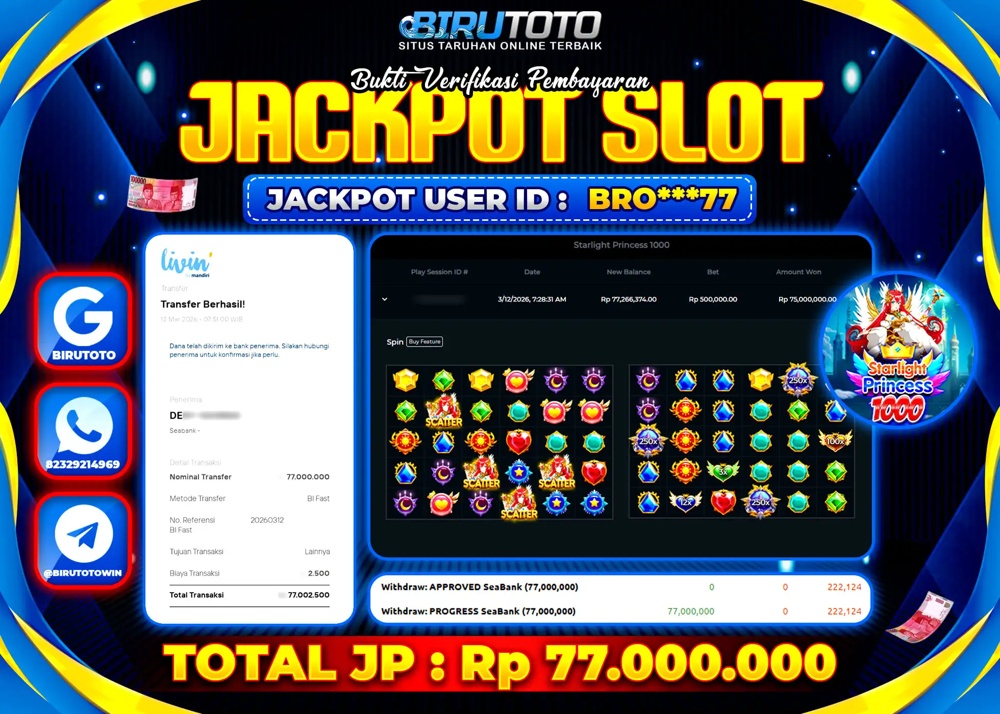 BIRUTOTO JACKPOT SLOT STARLIGHT PRINCESS 1000 Rp.77.000.000 LUNAS