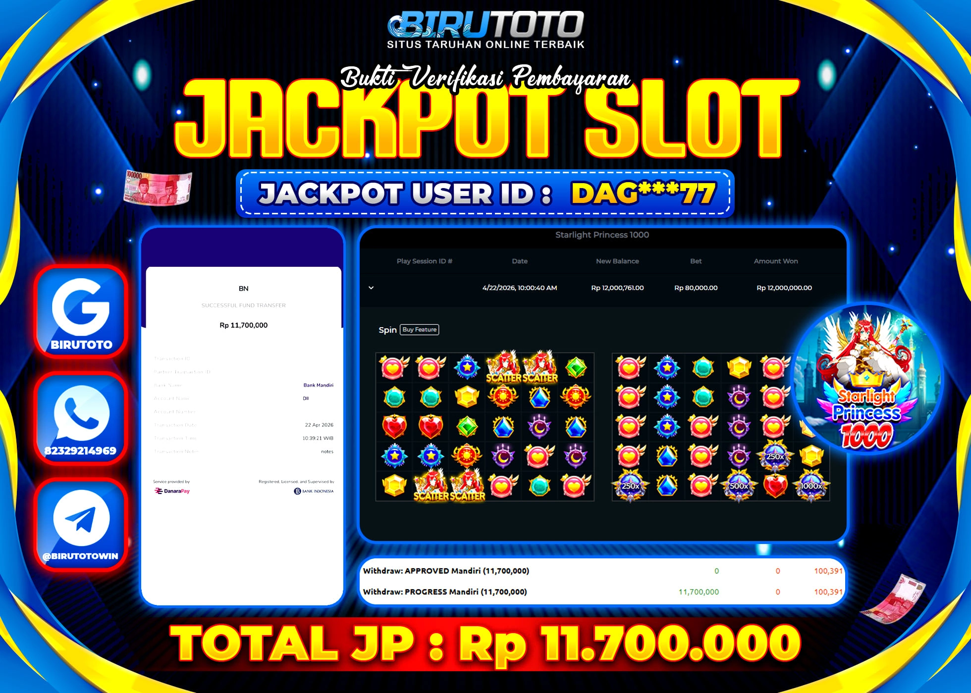 BIRUTOTO JACKPOT SLOT STARLIGHT PRINCES 1000 Rp.11.700.000 LUNAS