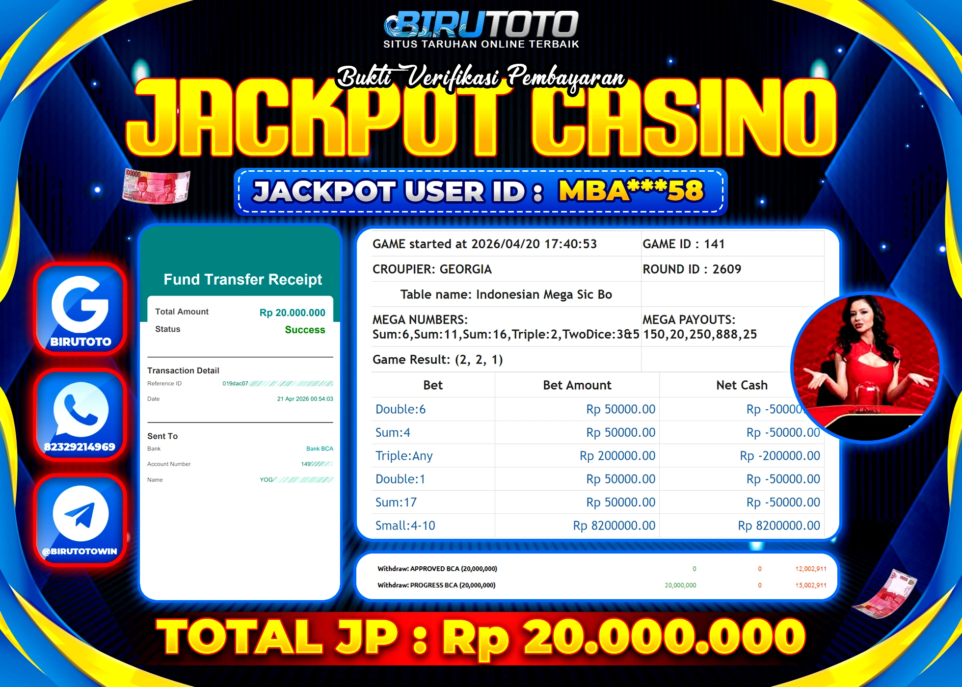 BIRUTOTO JACKPOT LIVE CASINO MEGA SICBO Rp.20.000.000 LUNAS